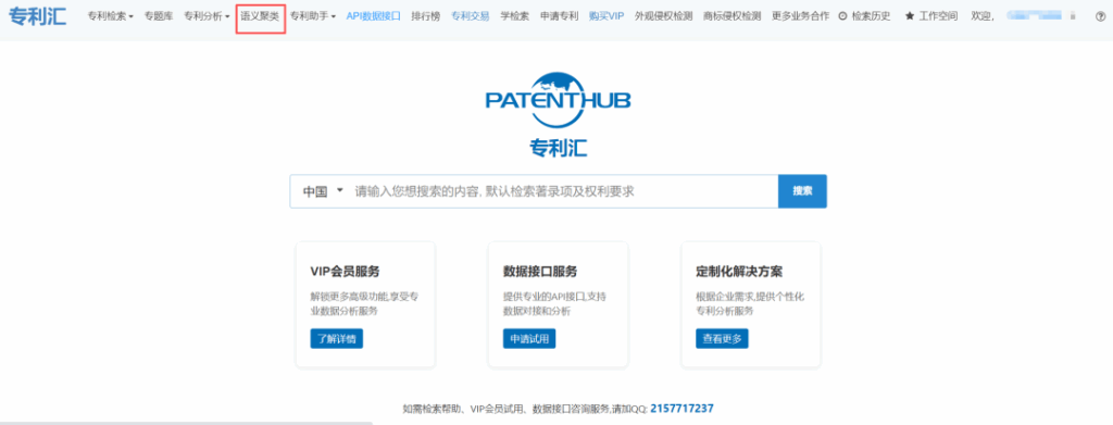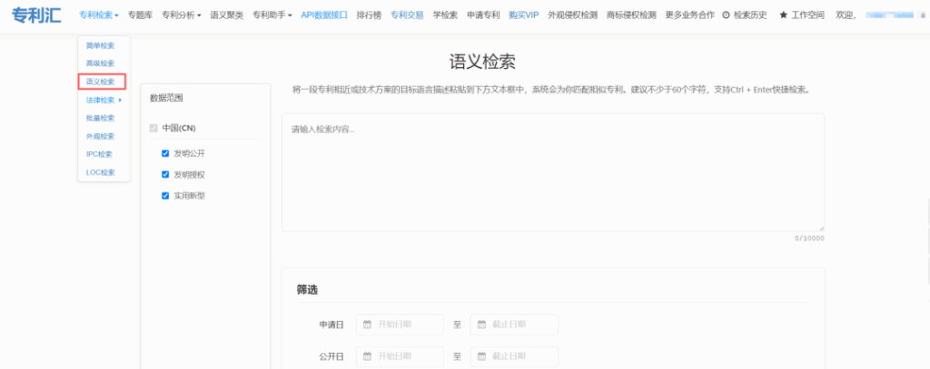 - 訪問入口登錄專利匯平臺,找到專利檢索模塊,選擇“語義檢索”選項,進入語義檢索頁面。