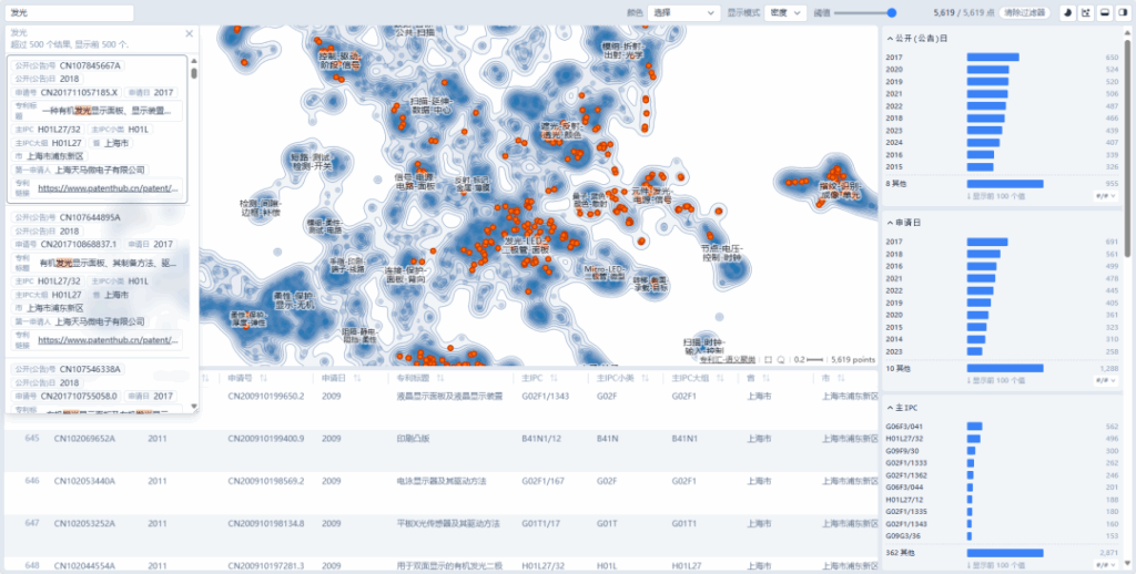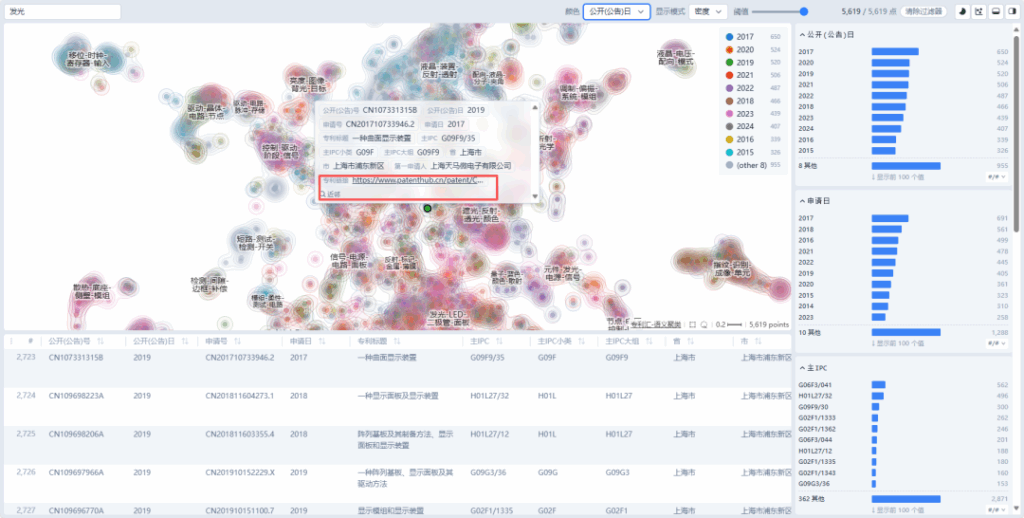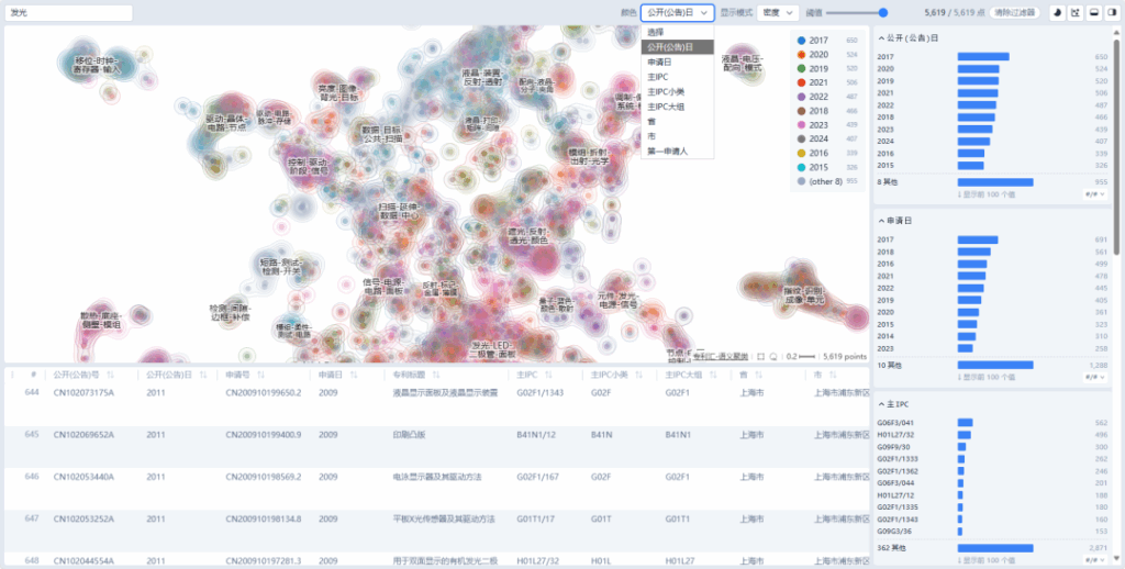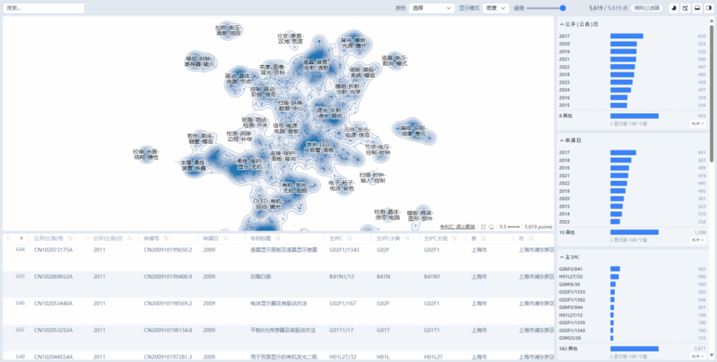 - 動態(tài)交互支持實時調(diào)整展示數(shù)據(jù),如公開(公告)日(年)、申請日、主IPC、省、市、區(qū)、第一申請人等。