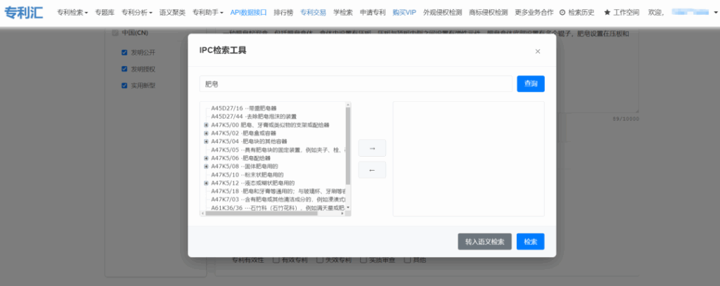- 設置篩選條件(可選)可限定專利類型、申請日期/公告日期范圍、分類號及法律狀態(tài)等條件,專利類型,申請/公告日期范圍,法律狀態(tài)字段,在界面根據(jù)自身需要勾選即可;分類號字段,可以手動輸入分類號,也可以使用系統(tǒng)提供的IPC檢索工具,進行分類號的搜索,搜索完成后,選擇轉入語義檢索即可。