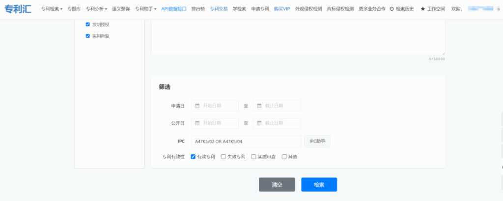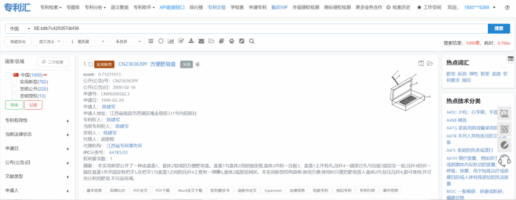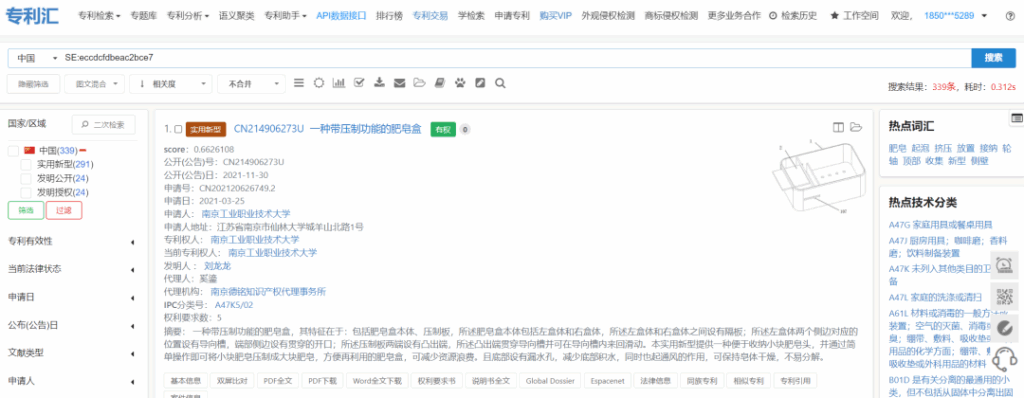 在此基礎上,我們也可以在檢索時指定IPC分類和專利有效性,來進一步縮小數(shù)據(jù)范圍,比如可以在前面的基礎上,增加IPC分類:A47K5/02 OR A47K5/04,有效性勾選有效,點擊檢索;